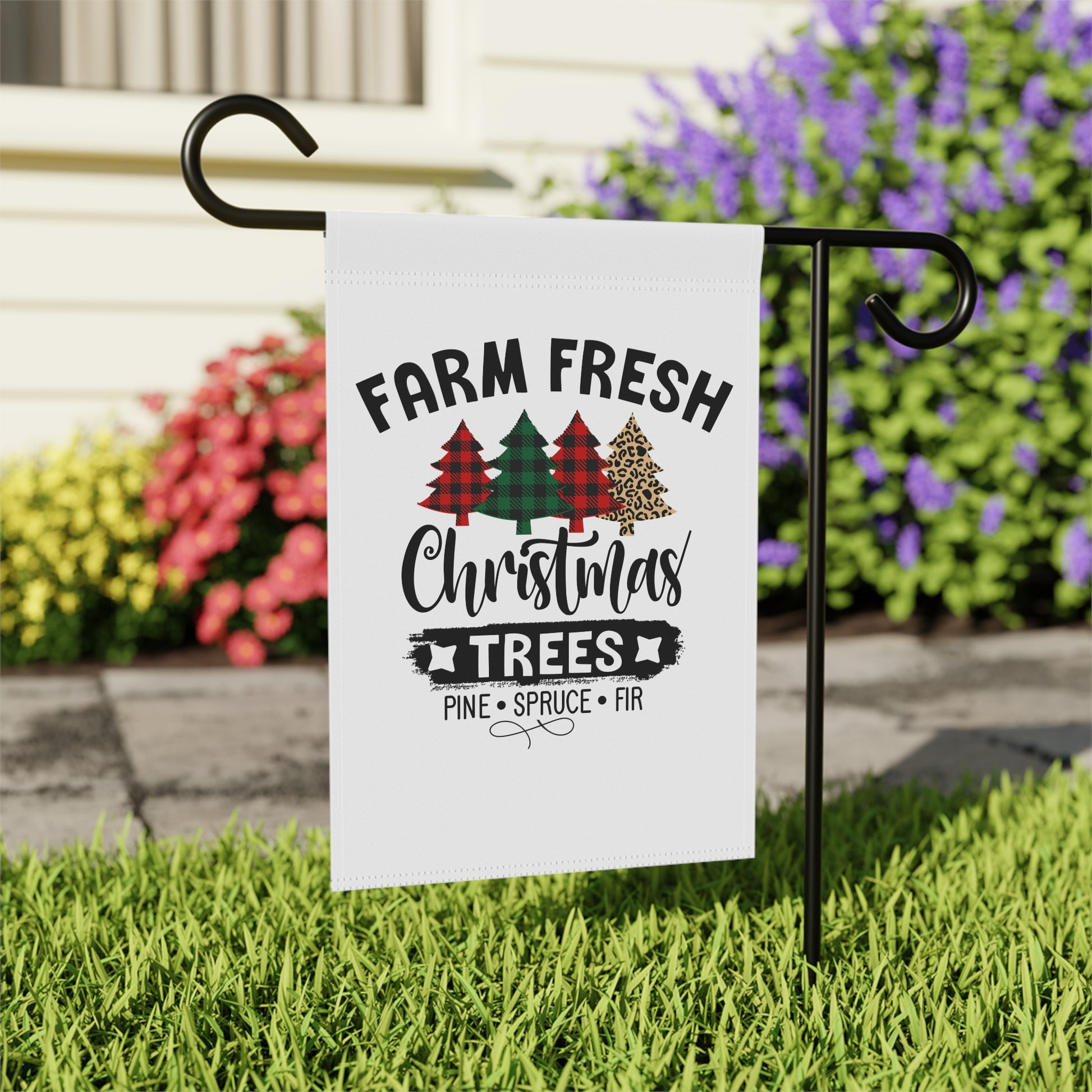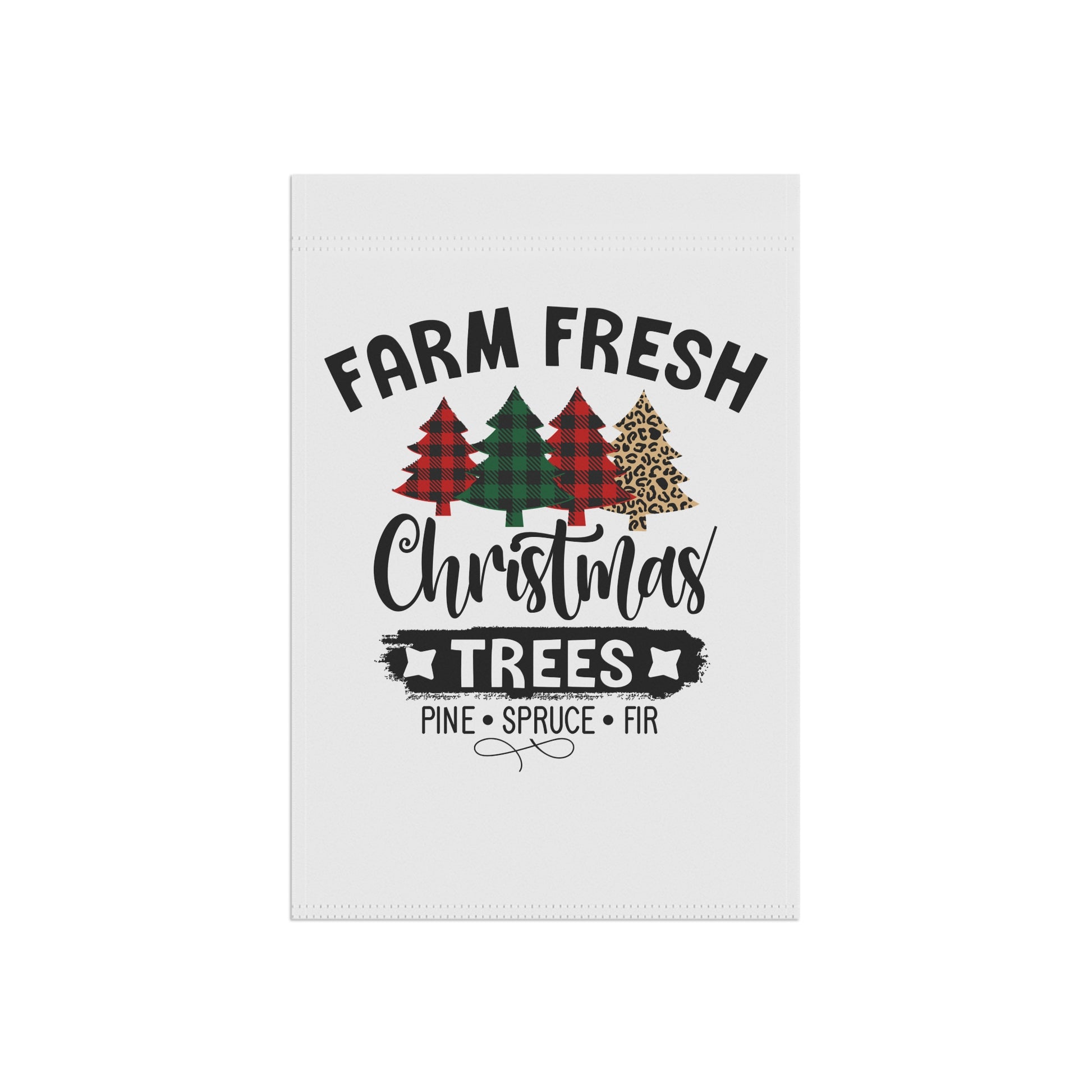 Farm Fresh Christmas Trees garden & house banner in Christmas plaid, perfect for adding a festive touch to your outdoor decor. Ideal for those who love holiday decorations and want to create a cozy Christmas atmosphere in their garden or home.